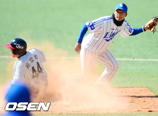 4회초 2사 주자 1,2루 LG 이대형의 2루수 앞 땅볼때 삼성 유격수 김상수가 2루에서 윤요섭을 포스아웃 처리하고 있다.