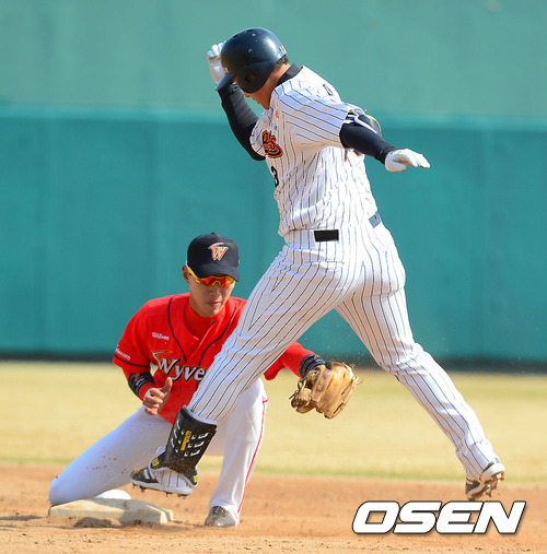 10일 부산 사직구장에서 열린 '2013 한국야쿠르트 세븐 프로야구' 롯데 자이언츠와 SK 와이번스의 시범경기 , 4회말 2사 2루 롯데 황재균이 선취 1타점 적시타를 날린뒤 SK 박승욱 2루수의 태그를 피하고 있다.