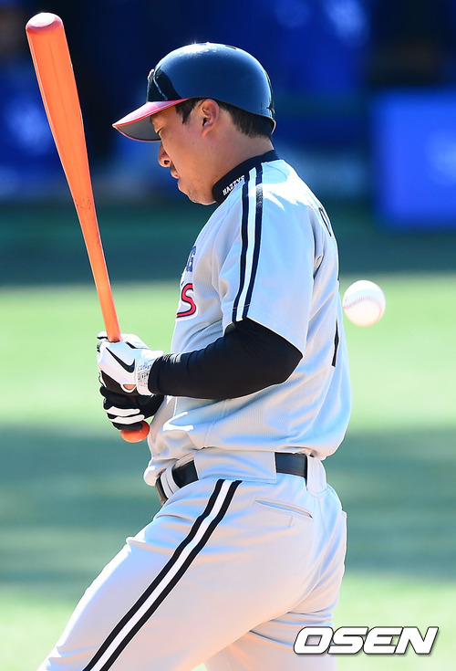 5회초 2사 주자 1루 LG 이병규가 타석에서 삼성 김기태가 던진 볼에 몸을 맞고 있다.