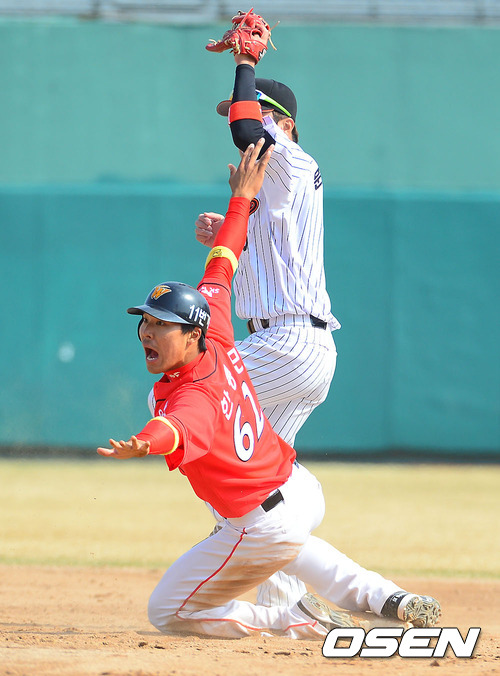 10일 부산 사직구장에서 열린 '2013 한국야쿠르트 세븐 프로야구' 롯데 자이언츠와 SK 와이번스의 시범경기 , 5회초 1사 1,2루 SK 김강민의 내야땅볼때 롯데 박기혁 유격수의 실책으로 1루 주자 한동민이 2루에서 세이프되고 있다