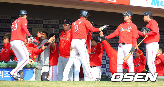 10일 부산 사직구장에서 열린 '2013 한국야쿠르트 세븐 프로야구' 롯데 자이언츠와 SK 와이번스의 시범경기 , 5회초 1사 만루 SK 조성우가 역전 희생플라이 날린후 동료들의 축하를 받고 있다.