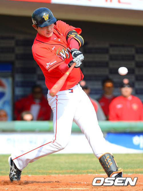 10일 부산 사직구장에서 열린 '2013 한국야쿠르트 세븐 프로야구' 롯데 자이언츠와 SK 와이번스의 시범경기 , 5회초 1사 만루 SK 조성우가 역전 희생플라이를 날리고 있다