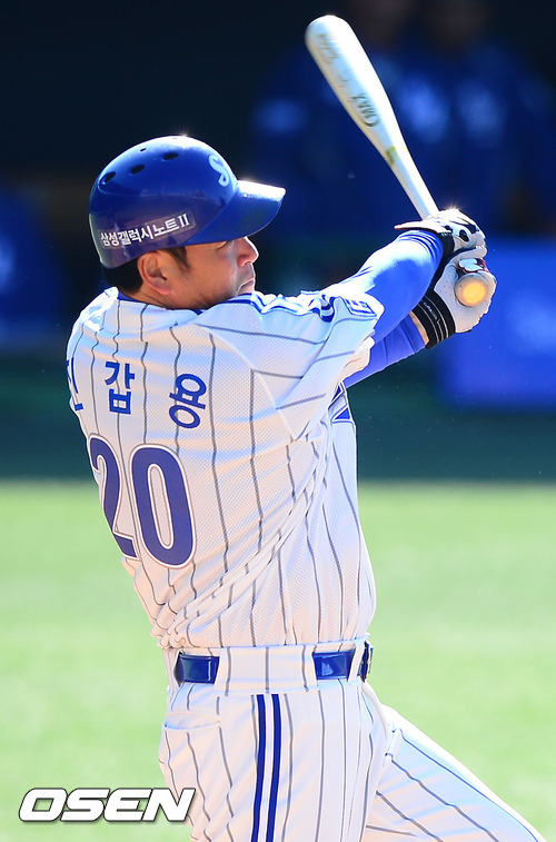 7회말 1사 주자 2루 대타로 타석에 오른 삼성 진갑용이 중견수 왼쪽 1타점 적시타를 날리고 있다.