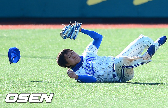 8회초 무사 주자 1루 LG 황선일의 좌익수 앞 타구를 삼성 좌익수 배영섭이 몸을 날리며 잡아내고 있다.