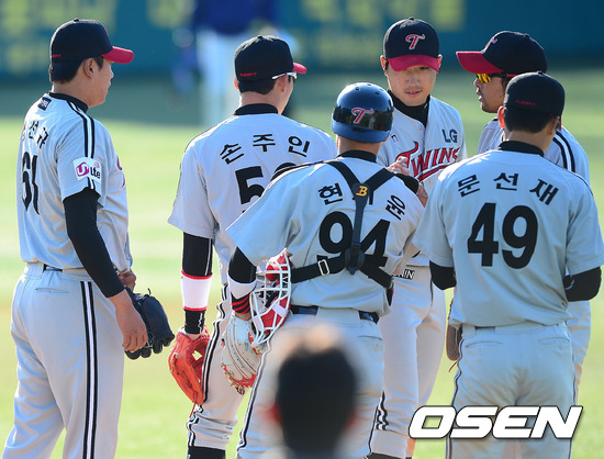 경기를 마치고 LG 선수들이 마운드 근처에 모여서 하이파이브를 하고 있다. / rumi@osen.co.kr