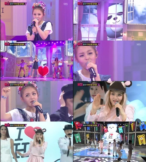 이날 이하이는 네이비색 원피스를 입고 귀여운 머리띠를 하고, 귀여운 제스쳐와 애교 만점 눈빛으로 여고생 가수의 매력을 듬뿍 살렸다. 성숙한 보이스 덕분에 전연령층을 아우르는 그지만, 이번에는 보다 더 16세 가수의 느낌이 강했다. 무대 후반부에는 뮤직비디오에서 호흡을 맞춘 '곰곰이'도 등장했다.