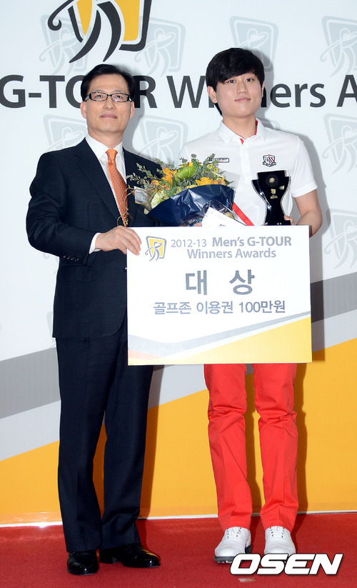 2012-13 Men`s G-TOUR Winners Awards에서 대상을 수상한 채성민이 한국투자증권 김정관 부사장으로부터 트로피와 상금을 건네받은 뒤 포토타임을 갖고 있다. / youngrae@osen.co.kr