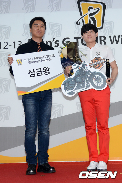 2012-13 Men`s G-TOUR Winners Awards에서 상금왕을 수상한 채성민이 할리 데이비슨 김은석 차장으로부터 트로피와 상금을 건네받은 뒤 포토타임을 갖고 있다. / youngrae@osen.co.kr