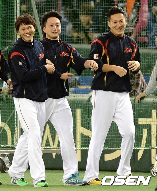 10일 오후 일본 도쿄돔에서 열린 '2013 월드베이스볼클래식(WBC)' 2라운드 1조 일본과 네덜란드의 승자전 경기, 경기에 앞서 일본 다나카가 동료들과 장난을 치며 스트레칭 훈련을 하고 있다.