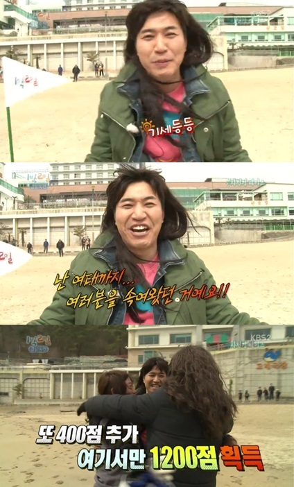이날 방송에서 김종민은 배우 엄태웅, 개그맨 이수근과 함께 한 팀을 이뤄 사자성어를 맞추는 미션을 수행했다. 이수근이 바다를 가로지르며 사자성어 문제를 내면 해변가에 있던 엄태웅과 김종민이 그것을 맞추는 형식.