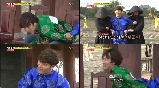 이날 김종국은 시간을 멈추게 하는 능력을 지닌 금검을 손에 넣은 하하에 의해 레이스가 시작하자마자 아웃 당하는 굴욕을 당했다. '런닝맨' 공인 능력자였지만 금검 앞에서는 속수무책이었기 때문.