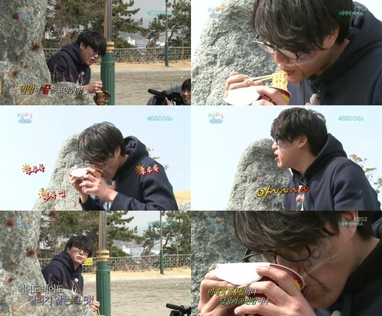 평소 '1박 2일'을 통해 맛있게 먹기로 유명한 성시경은 이날에도 컵라면을 맛있게 먹으며 보는 이들의 허기를 자극했다.