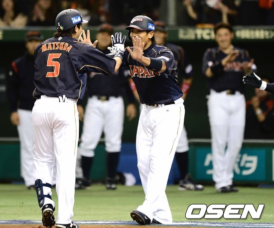 10일 오후 일본 도쿄돔에서 열린 '2013 월드베이스볼클래식(WBC)' 2라운드 1조 일본과 네덜란드의 승자전 경기, 2회초 1사 1루에서 일본 마쓰다가 투런 홈런을 날리고 홈을 밟은 1루주자 이나바와 하이파이브를 하고 있다.