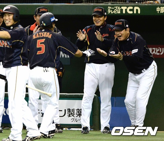 10일 오후 일본 도쿄돔에서 열린 '2013 월드베이스볼클래식(WBC)' 2라운드 1조 일본과 네덜란드의 승자전 경기, 2회초 1사 1루에서 일본 마쓰다가 투런 홈런을 날리고 홈에서 고지 감독의 축하를 받고 있다.
