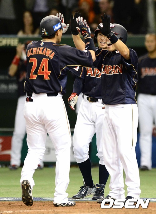 10일 오후 일본 도쿄돔에서 열린 '2013 월드베이스볼클래식(WBC)' 2라운드 1조 일본과 네덜란드의 승자전 경기, 2회초 1사 1,2루에서 일본 우치카와가 스리런 홈런을 날리고 홈에서 동료들의 축하를 받고 있다.