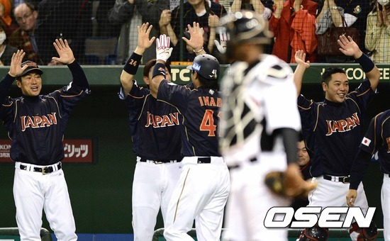 10일 오후 일본 도쿄돔에서 열린 '2013 월드베이스볼클래식(WBC)' 2라운드 1조 일본과 네덜란드의 승자전 경기, 3회초 1사 일본 이나바가 솔로 홈런을 치고 덕아웃에서 동료들의 축하를 받고 있다.