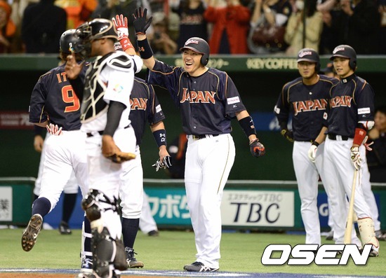 10일 오후 일본 도쿄돔에서 열린 '2013 월드베이스볼클래식(WBC)' 2라운드 1조 일본과 네덜란드의 승자전 경기, 3회말 1사 1,3루에서 일본 이토이가 스리런 홈런을 치고 홈에서 동료들의 축하를 받고 있다.