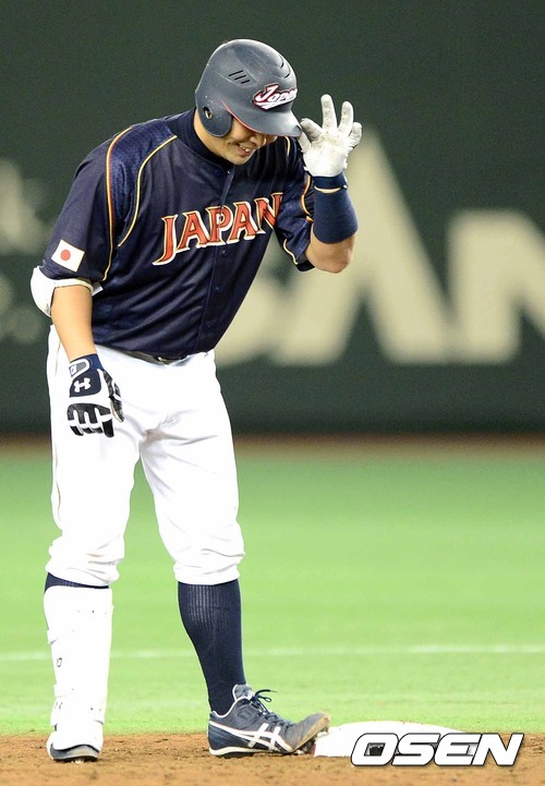 10일 오후 일본 도쿄돔에서 열린 '2013 월드베이스볼클래식(WBC)' 2라운드 1조 일본과 네덜란드의 승자전 경기, 4회말 2사 1,3루 일본 아베가 우전 적시타를 치고 환호하는 팬들에게 인사를 하고 있다.