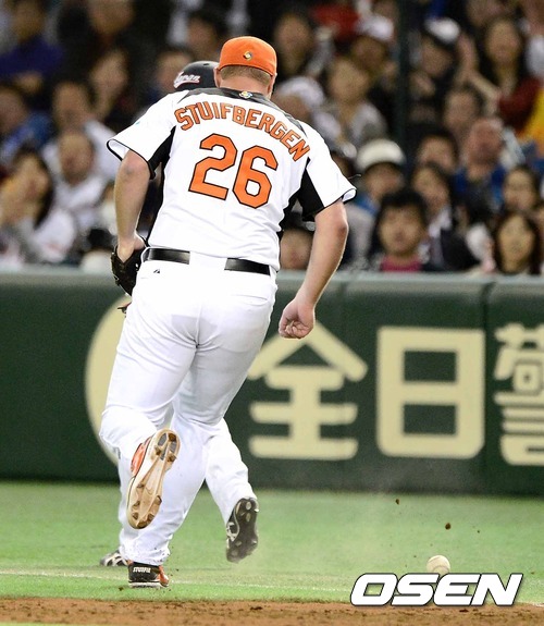 10일 오후 일본 도쿄돔에서 열린 '2013 월드베이스볼클래식(WBC)' 2라운드 1조 일본과 네덜란드의 승자전 경기, 3회말 1사에서 일본 우치카와의 내야땅볼 때 네덜란드 스투이프베르겐이 송구를 놓치고 있다. 우치카와는 안타를 기록했다.