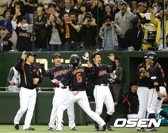 10일 오후 일본 도쿄돔에서 열린 '2013 월드베이스볼클래식(WBC)' 2라운드 1조 일본과 네덜란드의 승자전 경기, 7회초 1사 만루 일본 사카모토가 만루 홈런을 날리고 덕아웃에서 동료들의 축하를 받고 있다.
