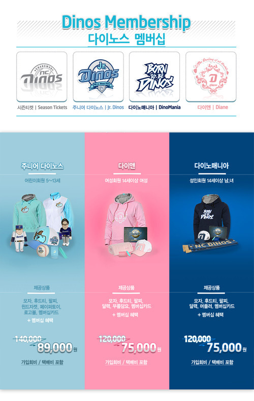 다이노스 멤버십은 ‘주니어 다이노스(Jr. Dinos)’, ‘다이노매니아(DinoMania)’, ‘다이앤(Diane)’, ‘시즌 티켓(Season Tickets)’ 등 4가지로 구성되며, 각 멤버십 별 회원가입 시 각종 용품과 함께 다양한 멤버십 혜택이 부여된다.