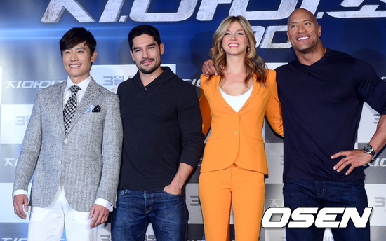 11일 오전 서울 여의도동 콘래드 서울호텔에서 열린 영화 '지.아이.조2' 내한 기자회견에서 이병헌, D.J. 코트로나, 애드리앤 펠리키, 드웨인 존슨이 포토타임을 갖고 있다.