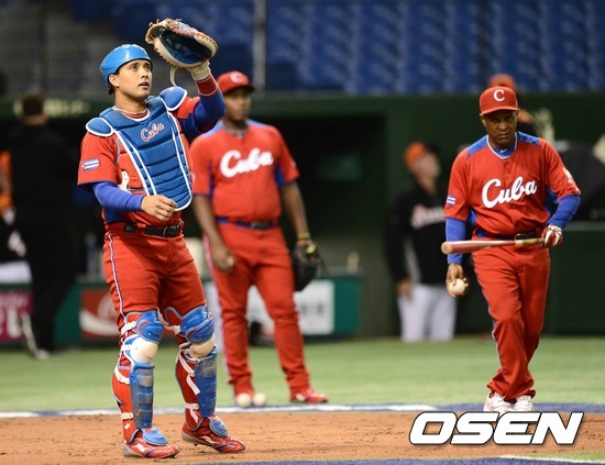 11일 오후 일본 도쿄돔에서 열린 '2013 월드베이스볼클래식(WBC)' 2라운드 1조 쿠바와 네덜란드의 경기, 경기에 앞서 쿠바 모레혼이 선수들의 훈련을 돕고 있다.