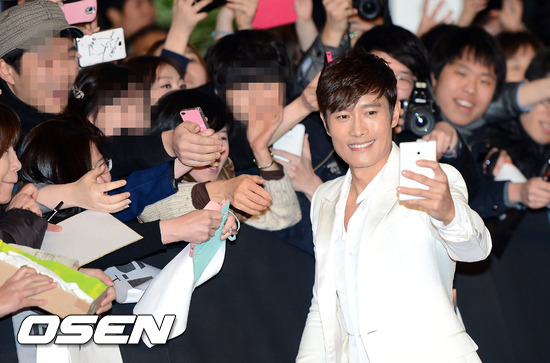 11일 오후 서울 영등포 타임스퀘어에서 진행된 영화 '지.아이.조2' 레드카펫 및 VIP 시사회 행사에서 이병헌이 스마트폰으로 셀카를 찍고 있다.