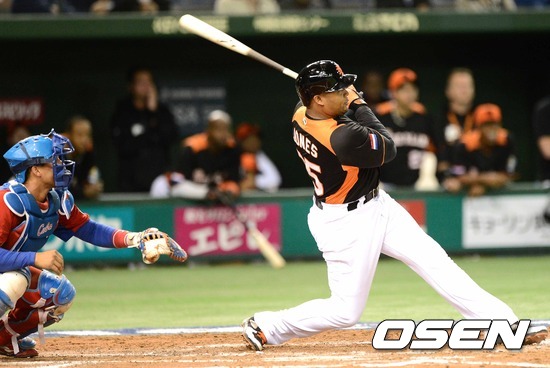 11일 오후 일본 도쿄돔에서 열린 '2013 월드베이스볼클래식(WBC)' 2라운드 1조 쿠바와 네덜란드의 경기, 3회말 1사 만루에서 네덜란드 존스가 희생플라이를 날리고 있다.