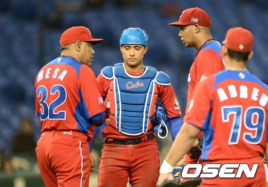 11일 오후 일본 도쿄돔에서 열린 '2013 월드베이스볼클래식(WBC)' 2라운드 1조 쿠바와 네덜란드의 경기, 3회말 1사 만루에서 마운드를 방문한 메사 감독이 투수 가르시아와 이야기를 나누고 있다.