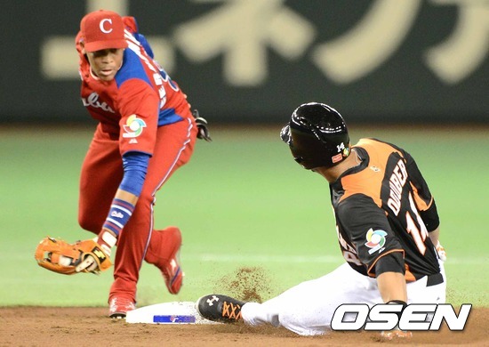 11일 오후 일본 도쿄돔에서 열린 '2013 월드베이스볼클래식(WBC)' 2라운드 1조 쿠바와 네덜란드의 경기, 3회말 무사에서 네덜란드 오두베르가 중전 2루타를 치고 세이프 되고 있다.