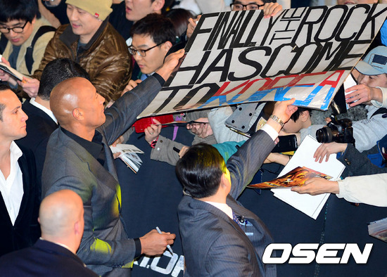 11일 오후 서울 영등포 타임스퀘어에서 열린 영화 '지.아이.조2' 레드카펫 행사에서 드웨인 존슨이 팬들에게 사인을 해주고 있다.