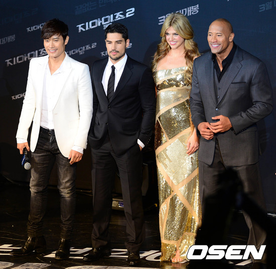 11일 오후 서울 영등포 타임스퀘어에서 열린 영화 '지.아이.조2' 레드카펫 행사에서 이병헌 D.j. 코트로나, 애드리앤 팰리키, 드웨인 존슨이 포토타임을 갖고 있다.