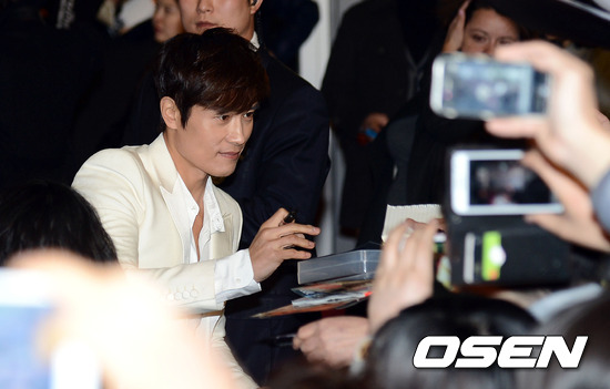11일 오후 서울 영등포 타임스퀘어에서 진행된 영화 '지.아이.조2' 레드카펫 및 VIP 시사회 행사에서 이병헌이 팬들에게 사인을 해주고 있다.