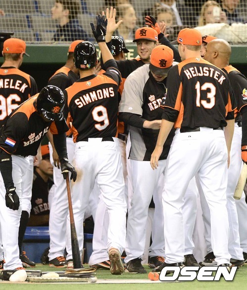 11일 오후 일본 도쿄돔에서 열린 '2013 월드베이스볼클래식(WBC)' 2라운드 1조 쿠바와 네덜란드의 경기, 4회말 1사 1,3루에서 네덜란드 시몬스가 희생플라이를 치고 덕아웃에서 동료들의 축하를 받고 있다.