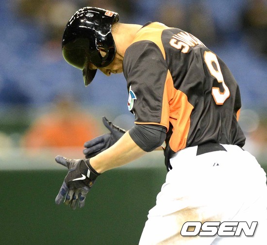11일 오후 일본 도쿄돔에서 열린 '2013 월드베이스볼클래식(WBC)' 2라운드 1조 쿠바와 네덜란드의 경기, 4회말 1사 1,3루에서 네덜란드 시몬스가 희생플라이를 치고 덕아웃으로 가며 환호하고 있다.