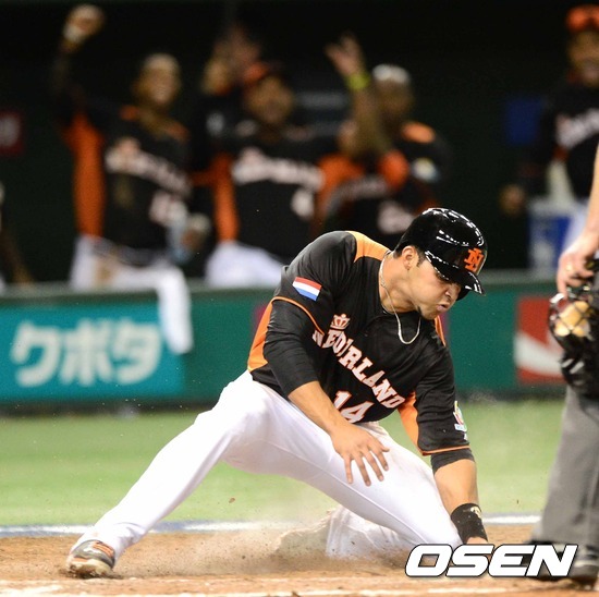11일 오후 일본 도쿄돔에서 열린 '2013 월드베이스볼클래식(WBC)' 2라운드 1조 쿠바와 네덜란드의 경기, 4회말 2사 2루 네덜란드 스홉 타석 때 3루 도루를 시도한 2루주자 오두베르가 공이 빠지자 홈으로 쇄도, 득점에 성공고 있다.