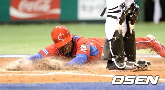 11일 오후 일본 도쿄돔에서 열린 '2013 월드베이스볼클래식(WBC)' 2라운드 1조 쿠바와 네덜란드의 경기, 5회초 1사 1,2루 쿠바 구리엘의 2타점 적시 2루타 때 1루주자 벨이 홈에서 슬라이딩을 하며 득점에 성공하고 있다.