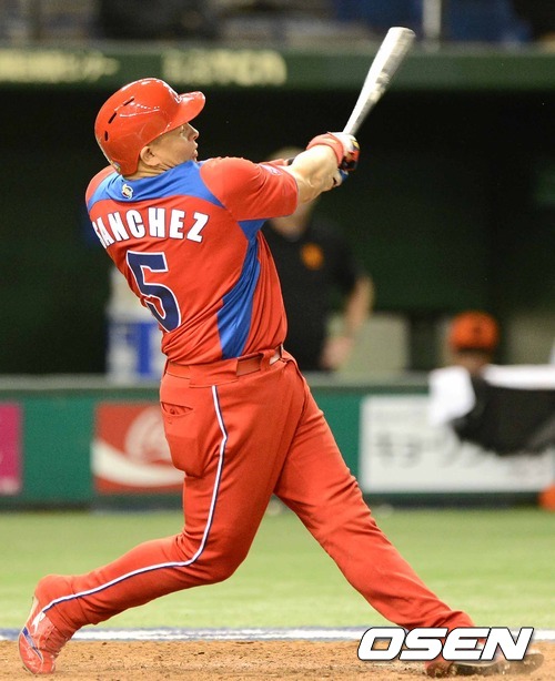 11일 오후 일본 도쿄돔에서 열린 '2013 월드베이스볼클래식(WBC)' 2라운드 1조 쿠바와 네덜란드의 경기, 8회초 1사 1,3루에서 쿠바 산체스가 희생플라이를 날리고 있다.