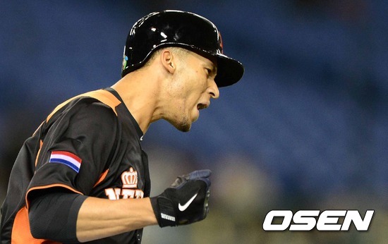 11일 오후 일본 도쿄돔에서 열린 '2013 월드베이스볼클래식(WBC)' 2라운드 1조 쿠바와 네덜란드의 경기, 8회말 2사 1루에서 네덜란드 시몬스가 동점 투런 홈런을 치고 환호하고 있다.