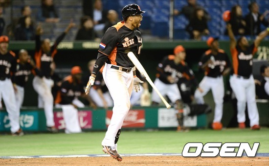 9회말 1사 만루에서 네덜란드 샘스가 끝내기 희생플라이를 치며 환호하고 있다./sunday@osen.co.kr