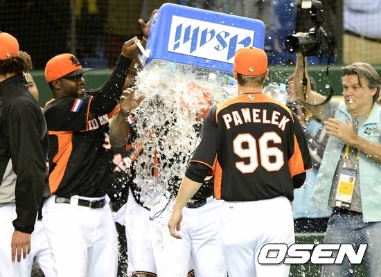 경기 종료 후 네덜란드 선수들이 뮬렌 감독의 머리 위에 아이스 박스의 얼음을 쏟고 있다./sunday@osen.co.kr
