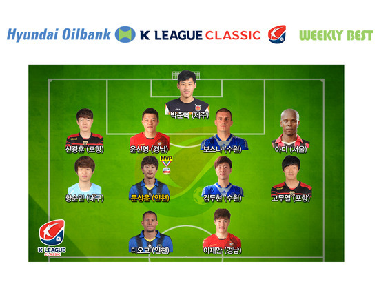 미드필더진에는 문상윤과 1골 1도움을 기록한 고무열(포항), 각각 1골씩을 넣은 김두현(수원), 황순민(대구)이 뽑혔다. 수비라인은 1골 1도움을 기록한 아디(서울)와 보스나(수원), 윤신영(경남), 신광훈(포항) 등이 이름을 올렸다. 골키퍼는 선방쇼를 선보인 제주의 박준혁이 선정됐다.