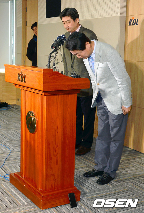 12일 오전 서울 신사동 프로농구연맹(KBL)에서 열린 '프로농구 승부조작 관련 대국민 사과 기자회견'에서 한선교 총재가 고개숙여 사과 인사를 하고 있다.