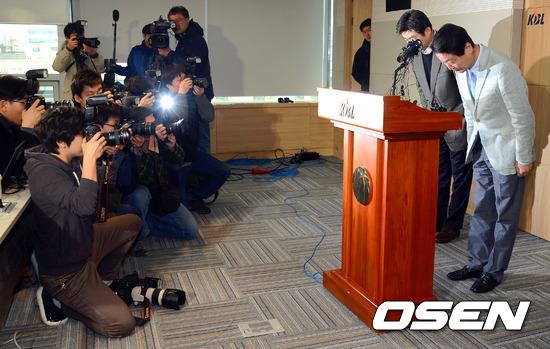 12일 오전 서울 신사동 프로농구연맹(KBL)에서 열린 '프로농구 승부조작 관련 대국민 사과 기자회견'에서 한선교 총재가 고개숙여 사과 인사를 하고 있다.