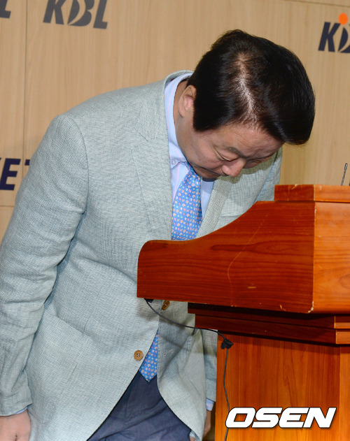 12일 오전 서울 신사동 프로농구연맹(KBL)에서 열린 '프로농구 승부조작 관련 대국민 사과 기자회견'에서 한선교 총재가 고개숙여 사과 인사를 하고 있다.