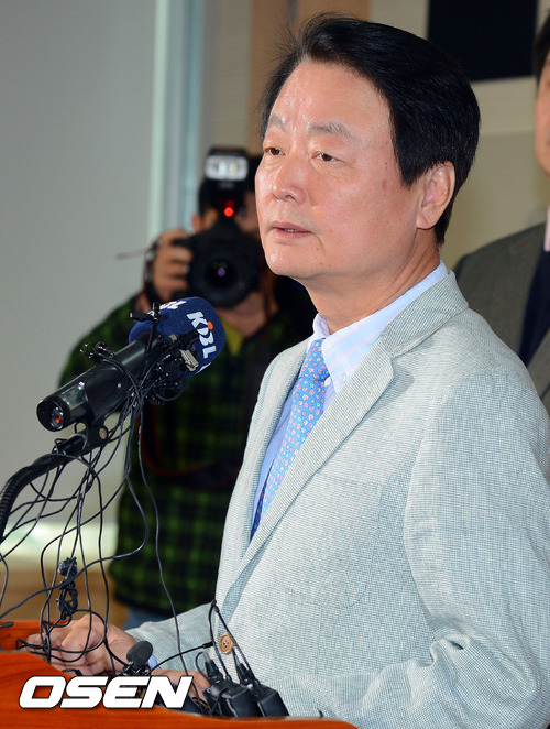 12일 오전 서울 신사동 프로농구연맹(KBL)에서 열린 '프로농구 승부조작 관련 대국민 사과 기자회견'에서 한선교 총재가 취재진의 질문에 답을 하고 있다.