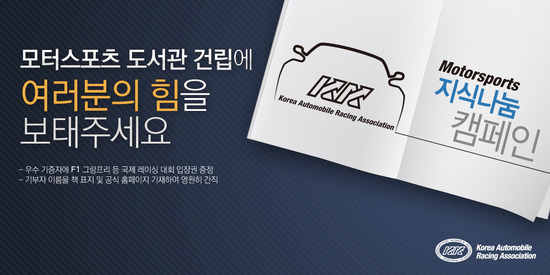 (사)한국자동차경주협회(변동식 협회장)가 오는 12일부터 무기한으로 회원 및 자동차경주 팬들을 대상으로 자료를 기증받아 이를 한 데 모으는 모터스포츠 지식 나눔 캠페인을 전개한다.