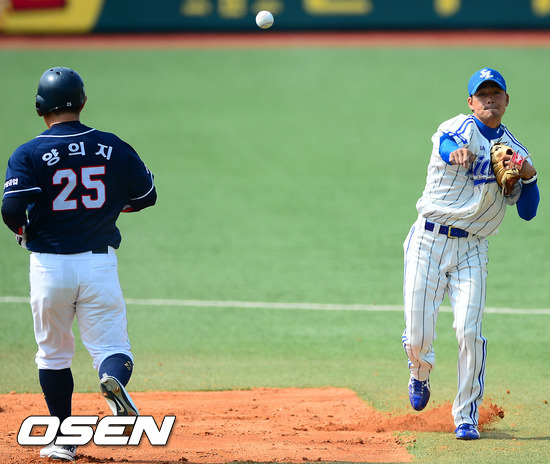 2회초 1사 주자 1,2루 두산 오재원의 2루수 앞 땅볼때 삼성 유격수 김상수가 2루에서 양의지를 포스아웃 시킨 후 1루로 송구하고 있다.