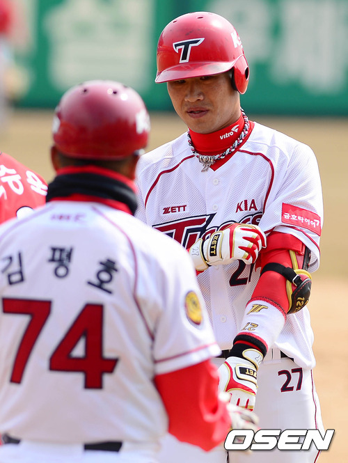 12일 오후 광주구장에서 열린 '2013 한국야쿠르트 세븐 프로야구' KIA 타이거즈와 SK 와이번스의 시범경기 4회말 2사 2,3루 김상현이 2타점 적시타를 치고 1루에서 김평호 코치에게 장비를 건내고 있다.